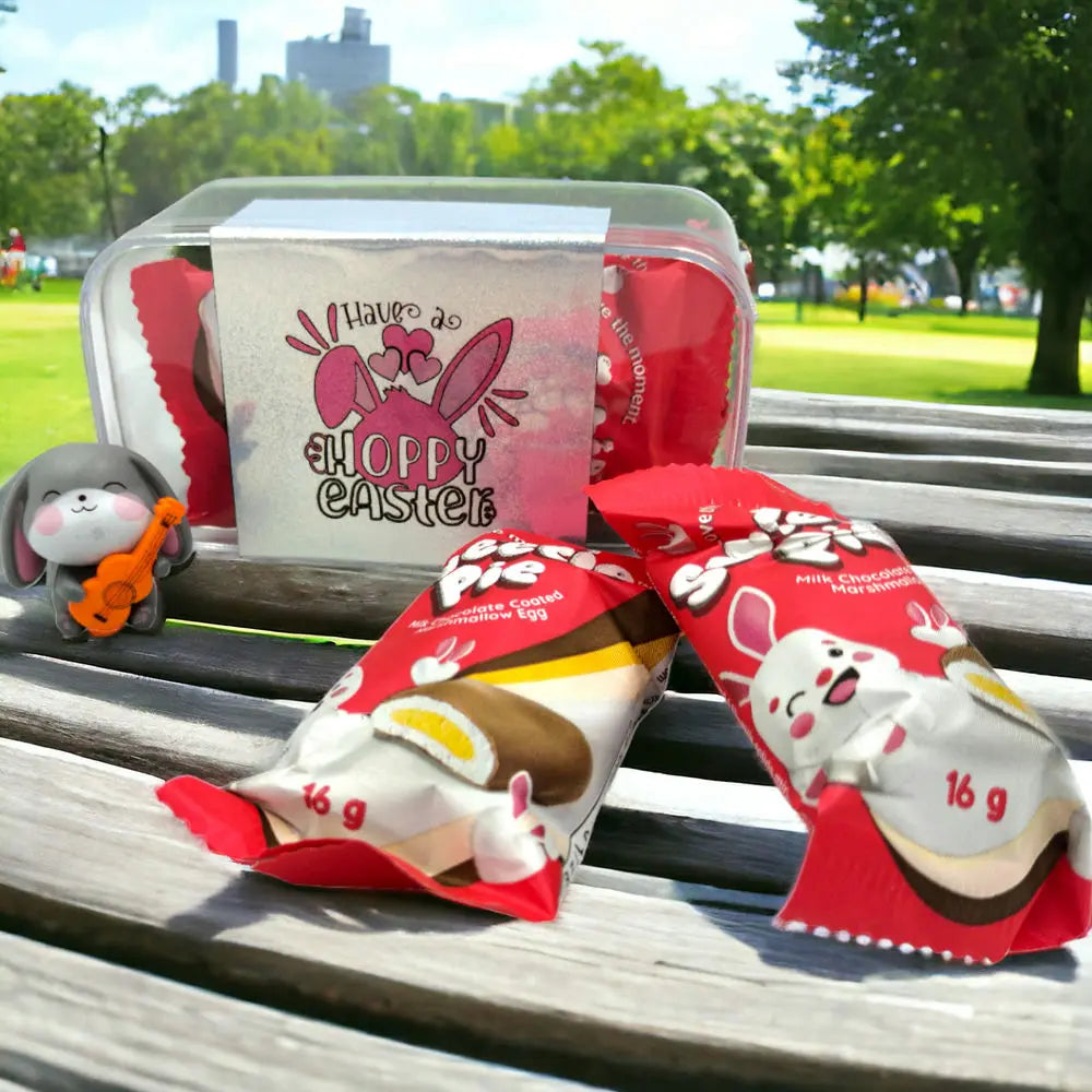 The bunny is expertly finished and can be seen enjoying playing songs on a guitar. The bunny rests on a patch of faux grass, nestled inside a re-usable clear container. The top of the container has been finished off with a holographic sticker which says “Have a Hoppy Easter”