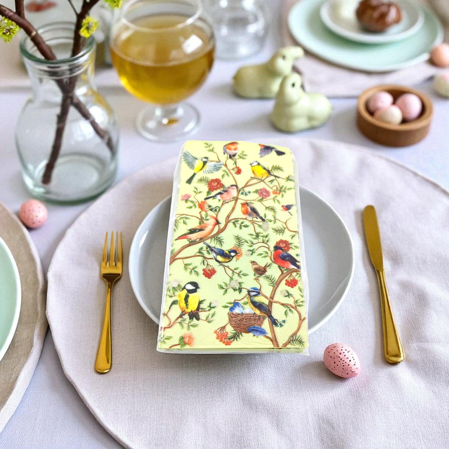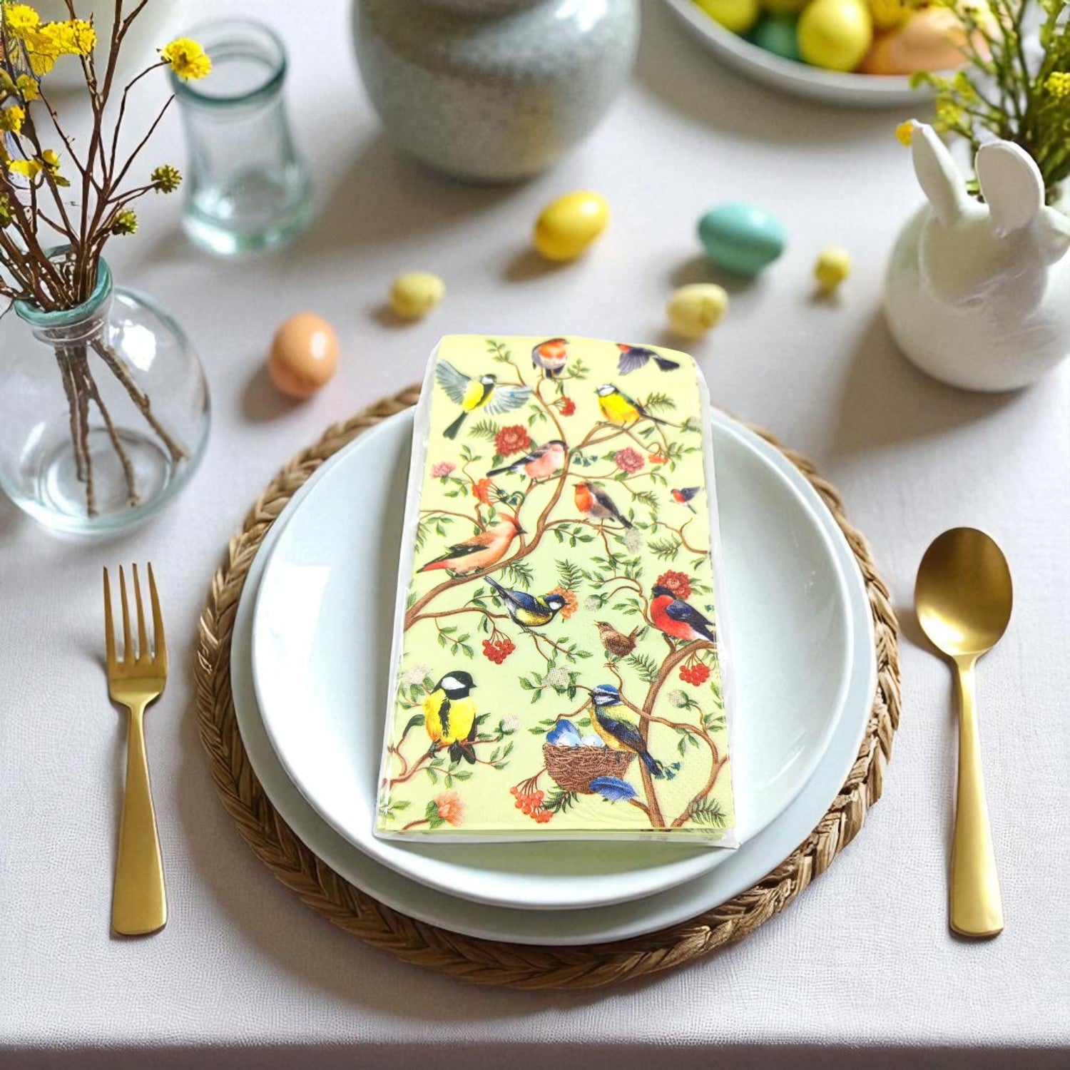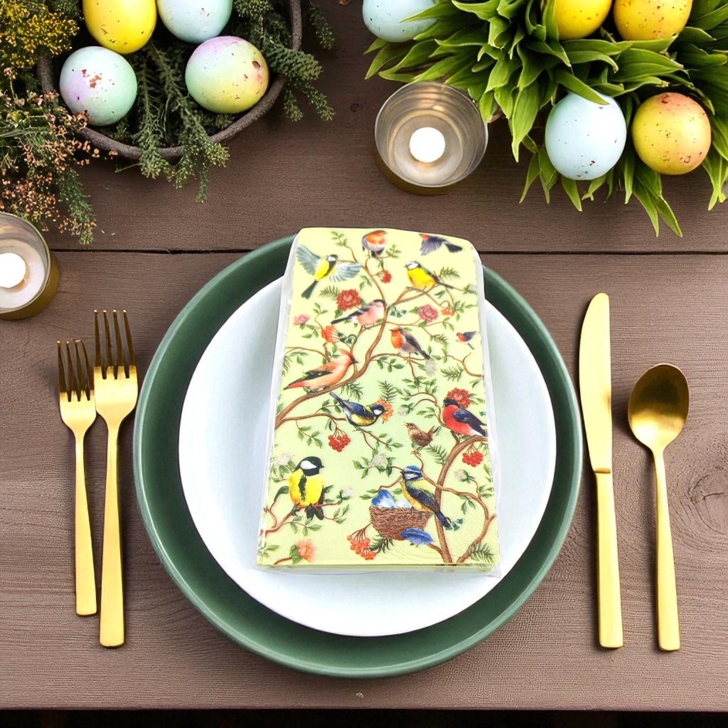 Easter table setting with pastel eggs, flowers, and a gray napkin on a light surface.