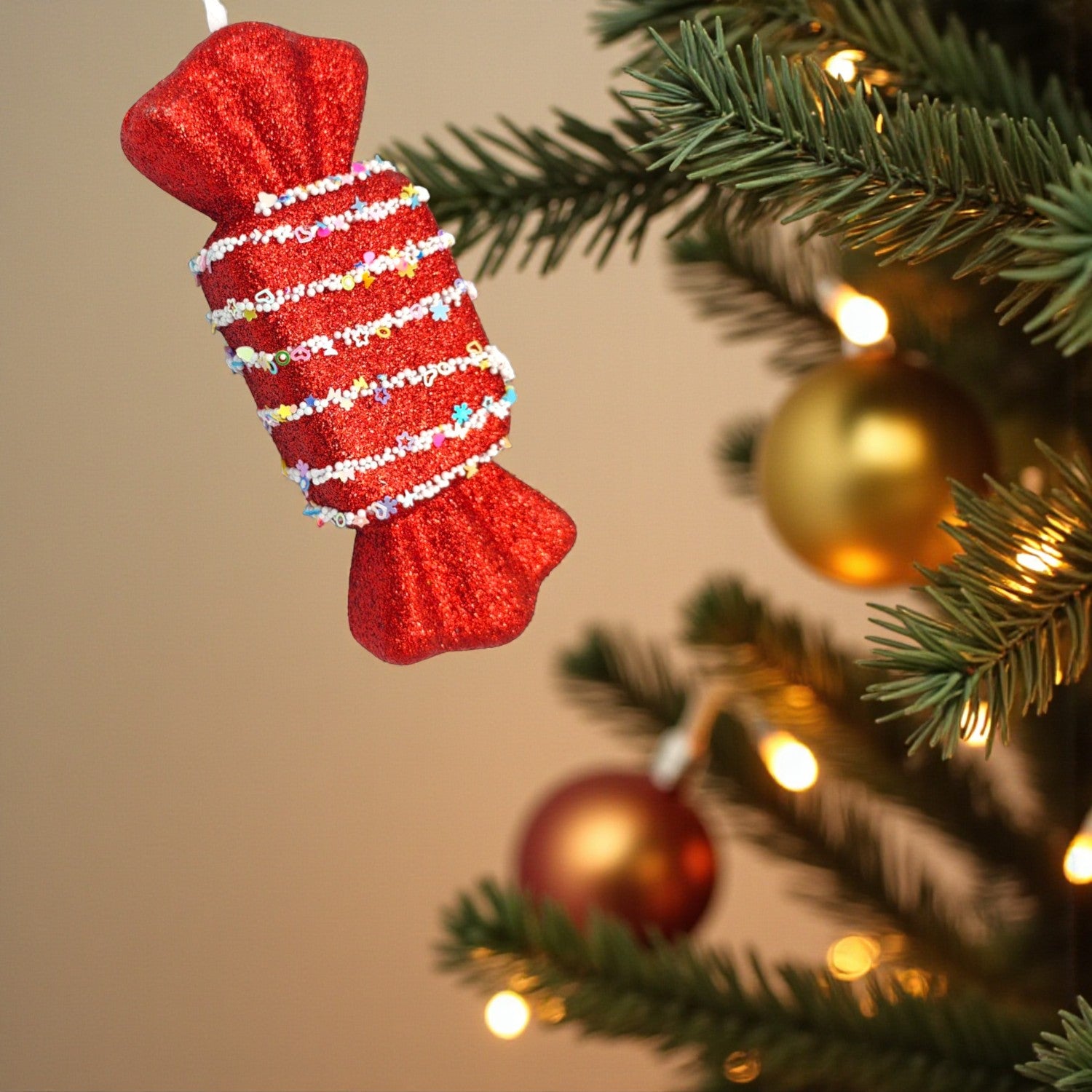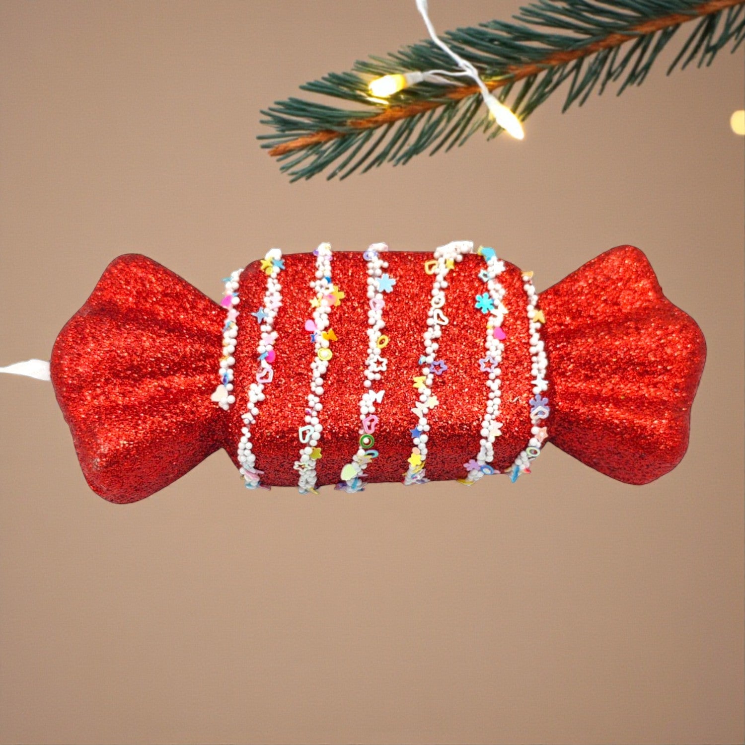 Add a festive pop of sweetness to your Christmas décor with our Glittered Peppermint Bonbon Ornament. Designed to mimic a wrapped candy, this charming bauble features bold red and white swirl stripes, finished with a fine glitter shine for that perfect holiday sparkle. A playful yet elegant accent, it works beautifully on both whimsical and classic Christmas trees.